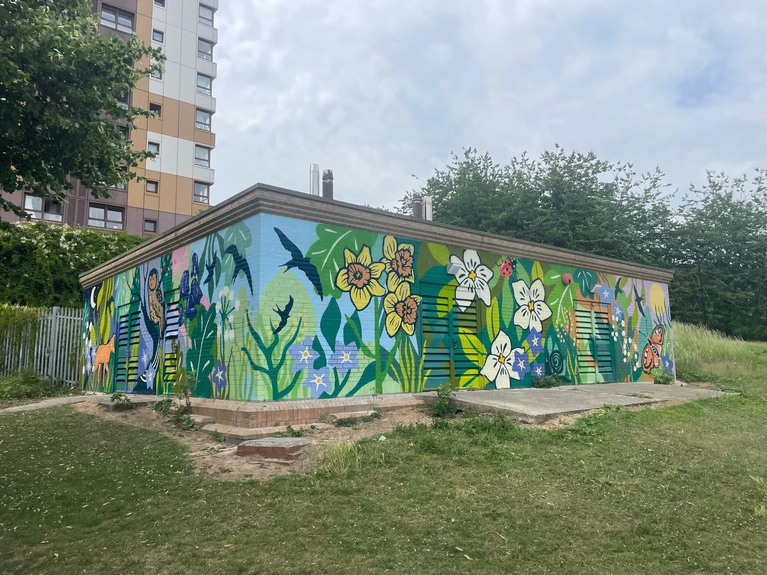 The boiler house, which overlooks the children’s playground, was once an eyesore and target for graffiti, and is now a colourful representation of the natural area and its community who use it.