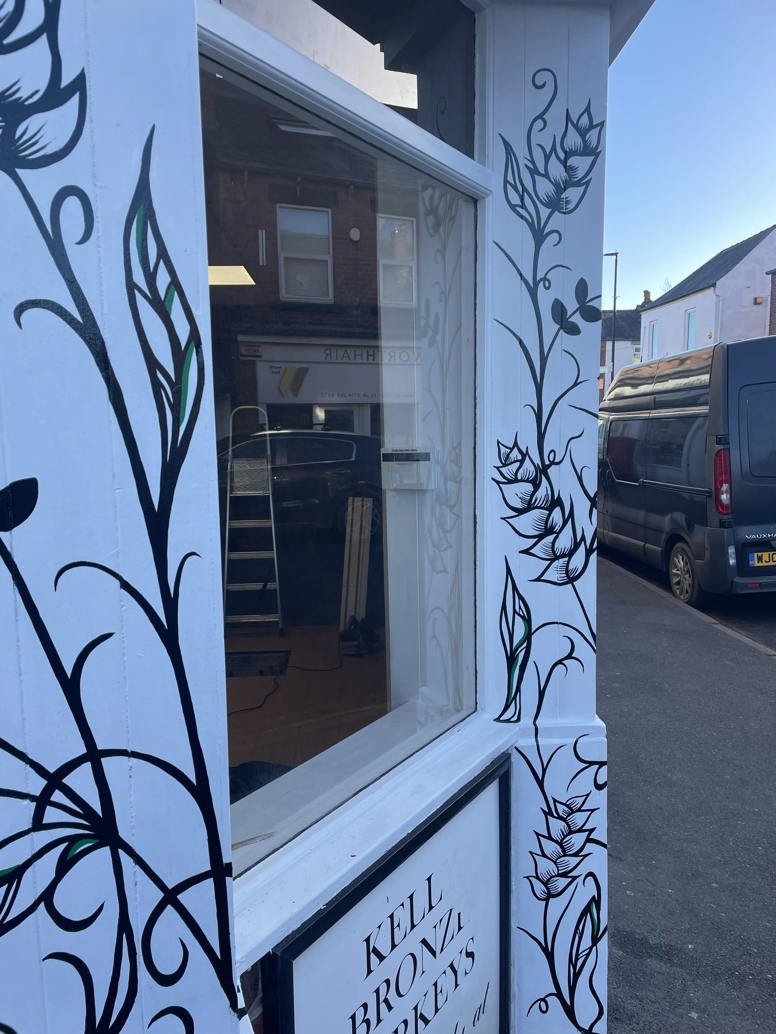 Hand painted signage and floral embellishment for Nue Cafe, a brand new cafe and deli on Sharrowvale Road (Sheffield) which specialises in gluten free food. Their logo was their own design, and the brief for the embellishments was something elegant and fine in black with highlights of green. They wanted wheat and barley to feature, which would represent gluten, and that it would stay outside and not be found on the inside!