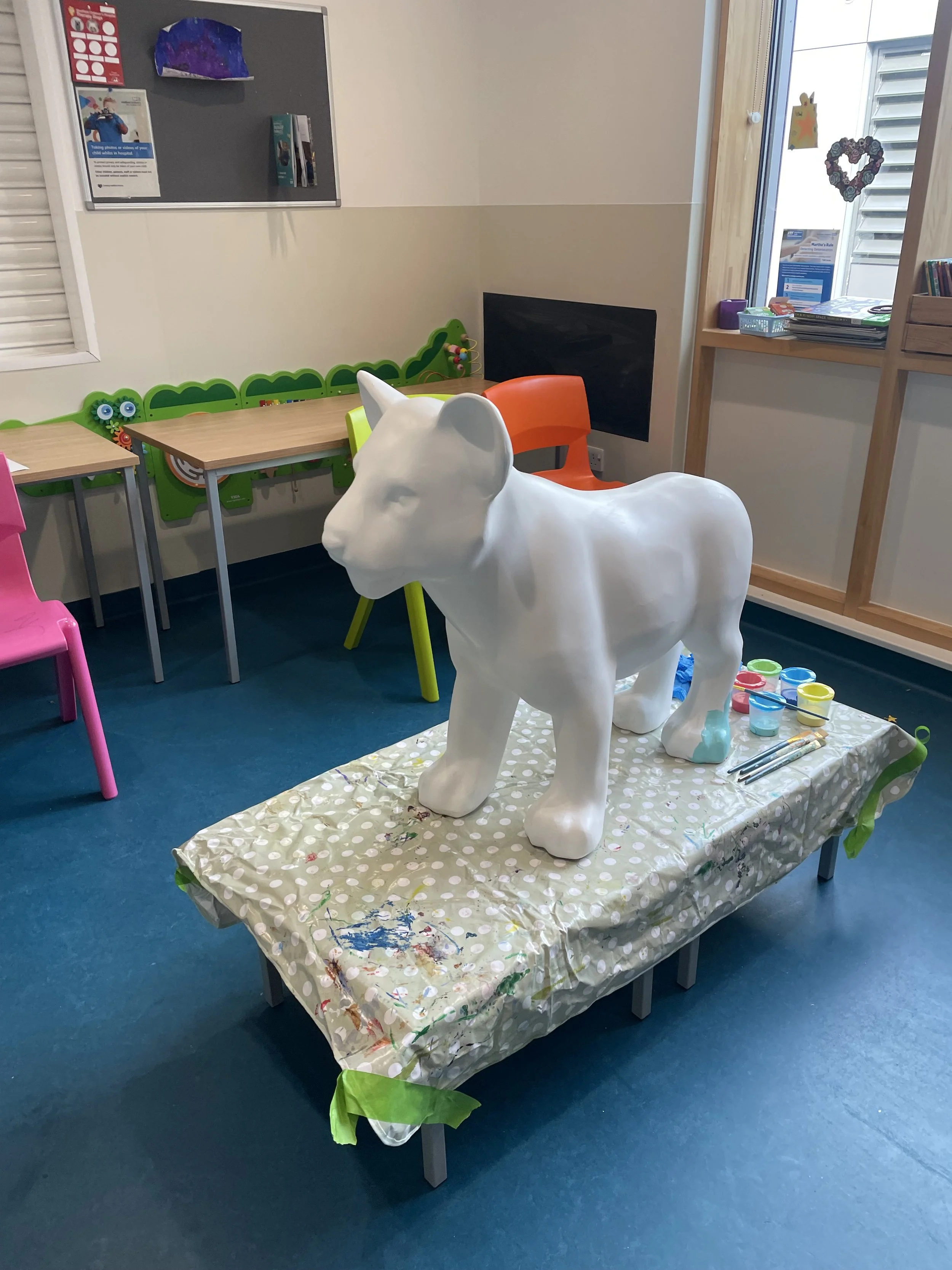 I worked with the Kingfisher School at Sheffield Children’s Hospital to design and paint their lion cub statue ‘Hero’, for the Pride Of Yorkshire Trail. Patients and teachers at the hospital helped painted a bright colourful background on Hero, then each created their own designs, which I collated into a cohesive design representing everyone’s ideas.